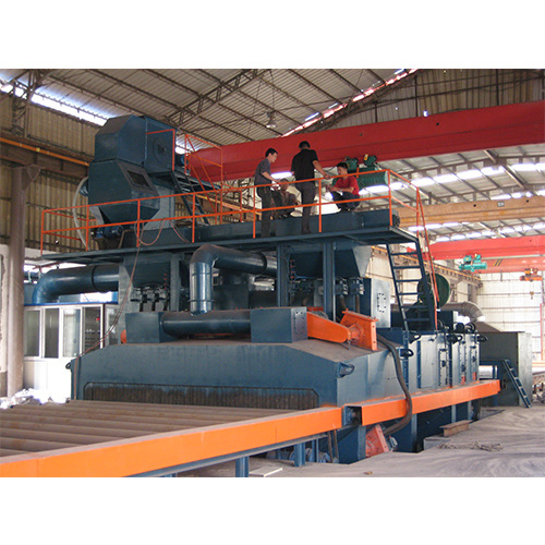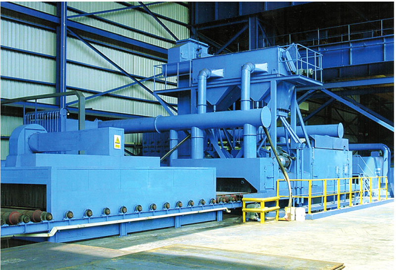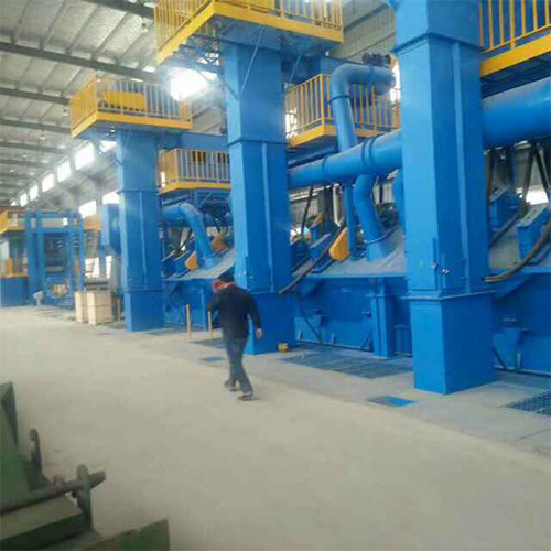 هذا الجهاز عبارة عن عملية مستمرة ذات كفاءة وجودة عالية خلال خط الإنتاج تتم المعالجة المسبقة للصفائح الفولاذية. بعد أن يتم التسخين المسبق للوحة الفولاذية بواسطة طاولة الأسطوانة ، التي تدخل غرفة تنظيف السفع بالخردق. يستخدم عدد من آلات السفع بالخردق عالية الكفاءة ذات اتجاهات و إحداثيات مختلفة طلقة فولاذية لتوليد تأثير قوي واحتكاك ؛ يمكن تقشير طبقة الأكسيد وبقع الصدأ والأوساخ على السطح بسرعة ، ويمكن تنظيف السطح الفولاذي وتقويته. أثناء عملية السفع بالخردق ، يتم جمع خليط غبار الحبيبات المتناثرة تحت الاله من خلال قمع الغرفة الرئيسية والناقل اللولبي الطولي ؛ ثم يتم رفعه إلى الفاصل فوق الماكينة لفصل الحبيبات والغبار. تسقط الجزيئات المنفصلة في مجرى الفاصل. و يتم نقلها إلى كل آلة نسف بالخردق من خلال خط الأنابيب في الموقع لإعادة التدوير. يتم نقل الغبار المتولد أثناء العمل إلى نظام إزالة الغبار من خلال أنبوب العادم. يتم تصريف الهواء النقي بعد التنقية في الهواء الطلق. وتلتقط معدات جمع الغبار جسيمات الغبار وتجمعه.